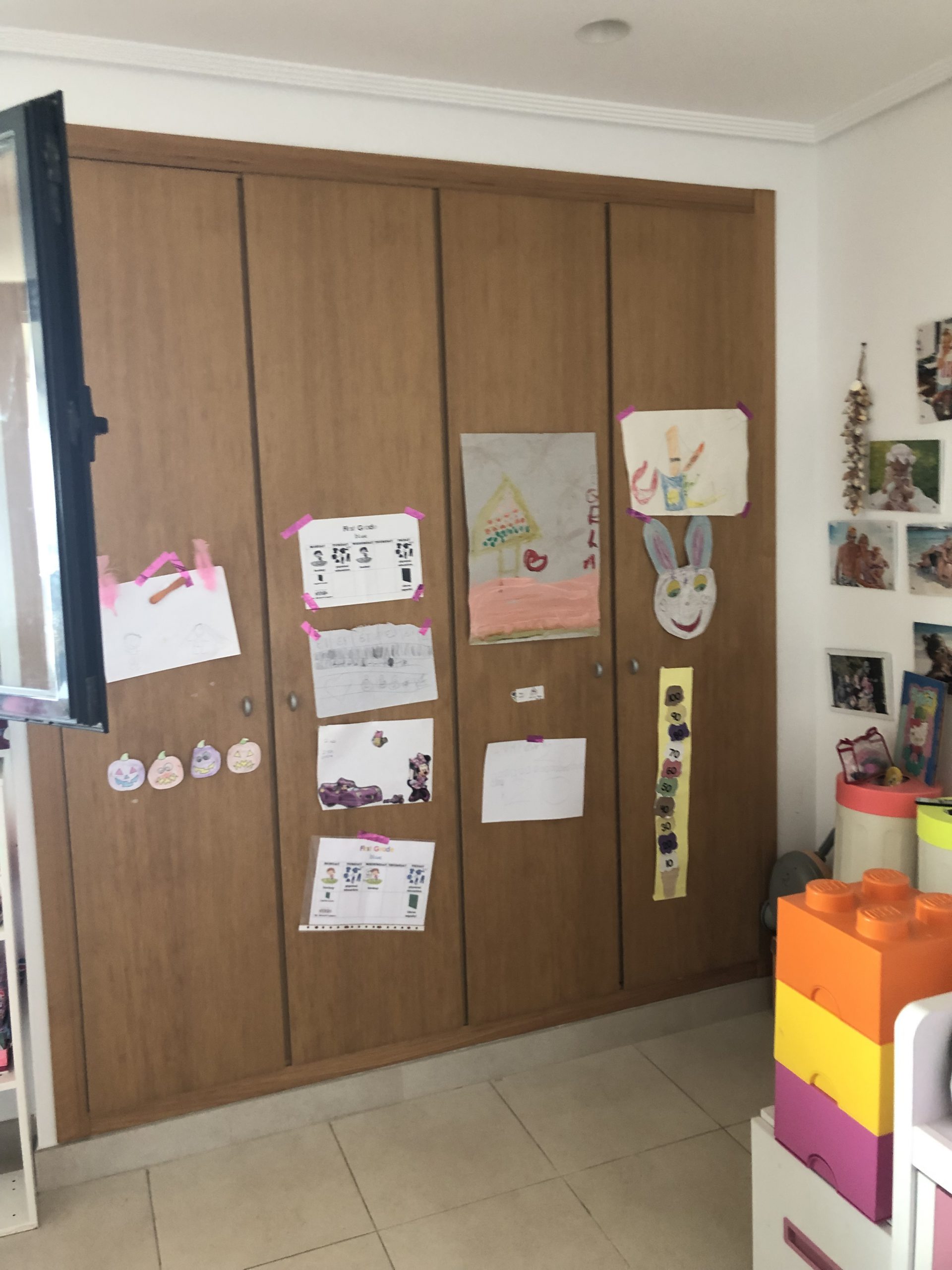 Un muro a media altura rematado con una pieza de marmol, cumple un doble fución : Cabezal para la cama con zona de apoyo / Zona lavabo
