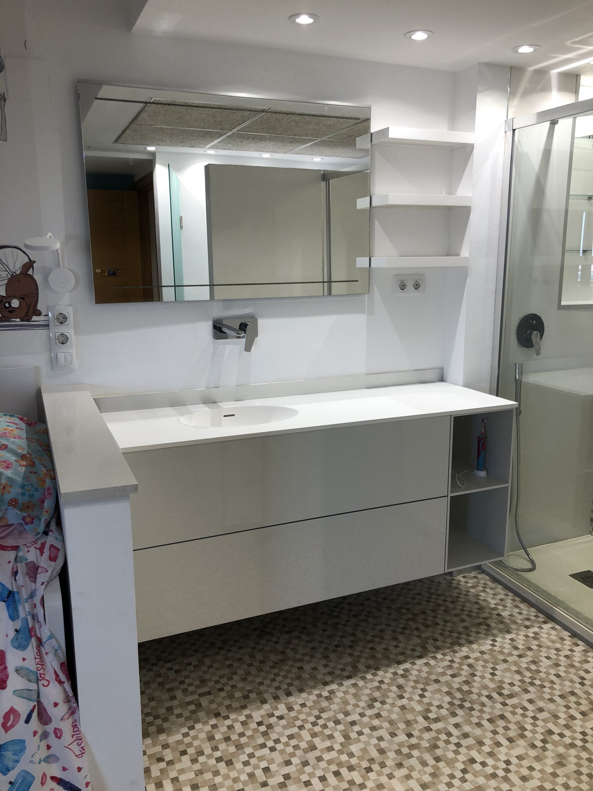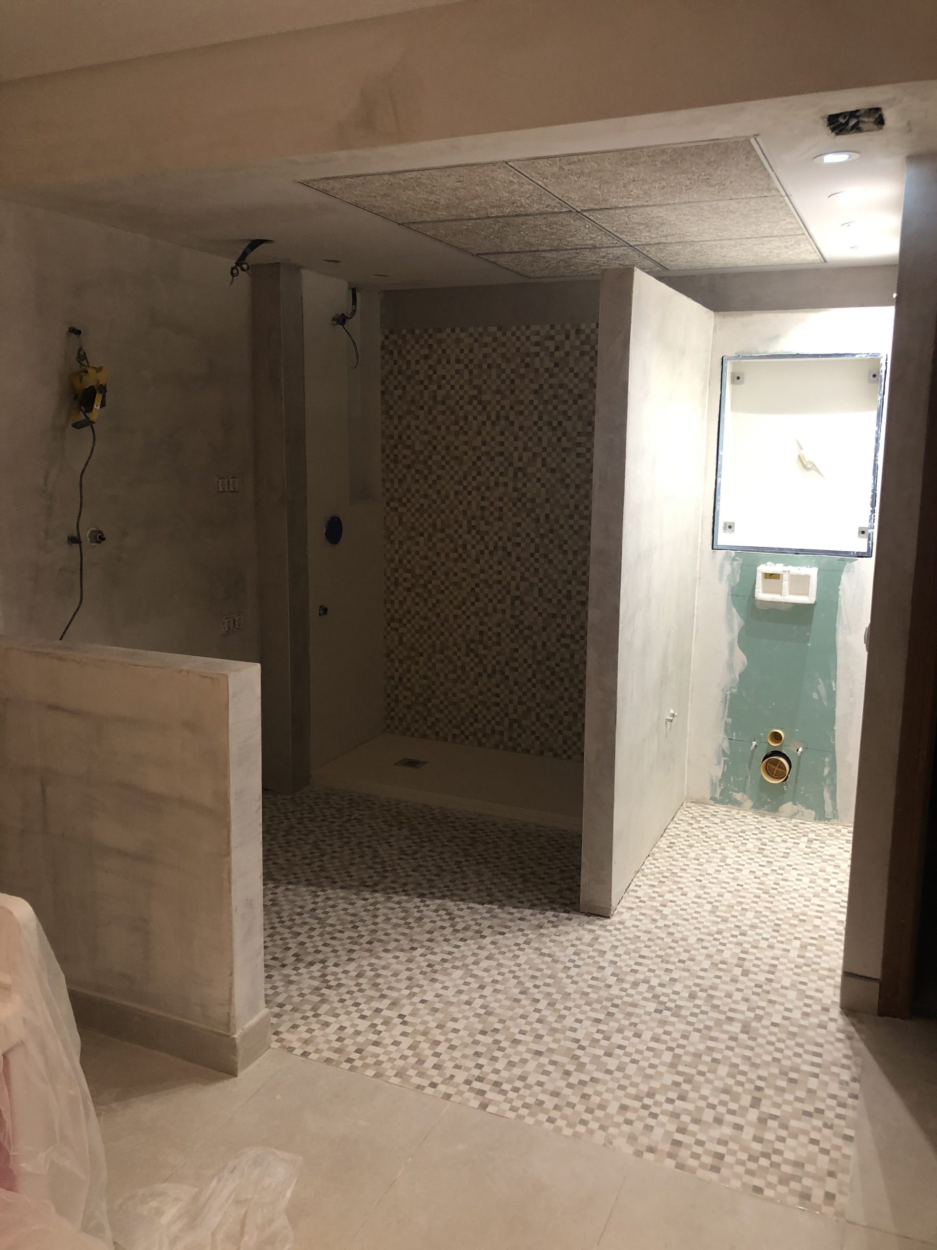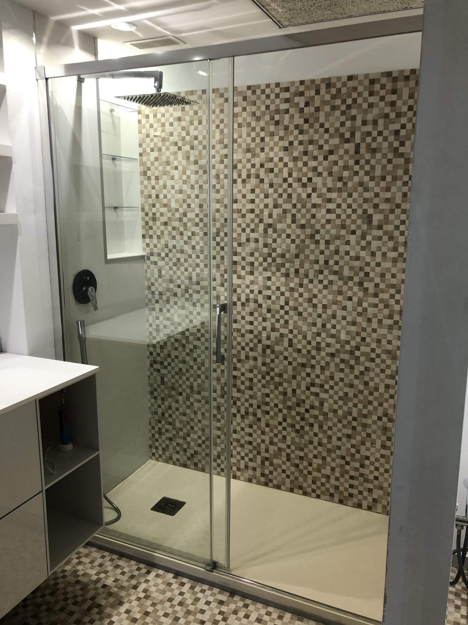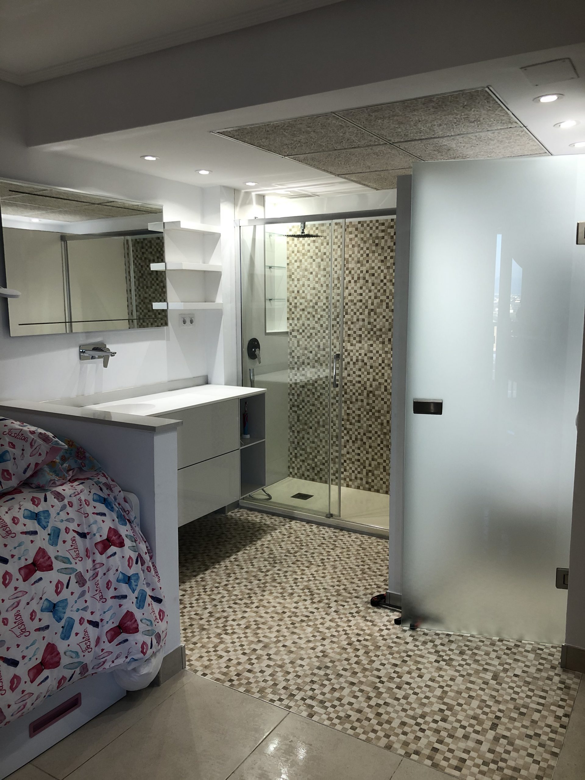 Reforma realizada para integral baño de pasillo en dormitorio para que sea una única estancia, Deferenciando los espacios por los distintos materiales y colores, con zona de higiene independiente con puerta de vidrio.