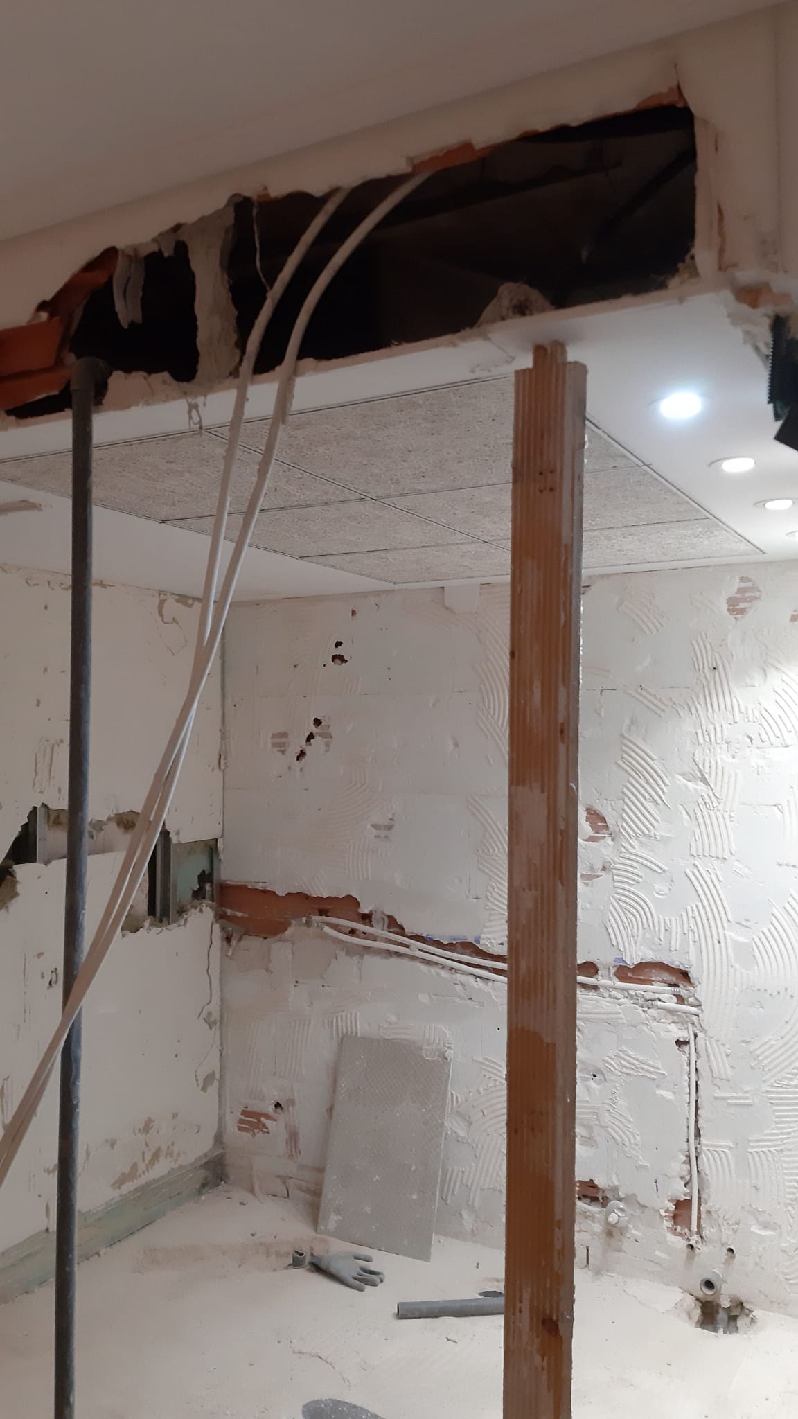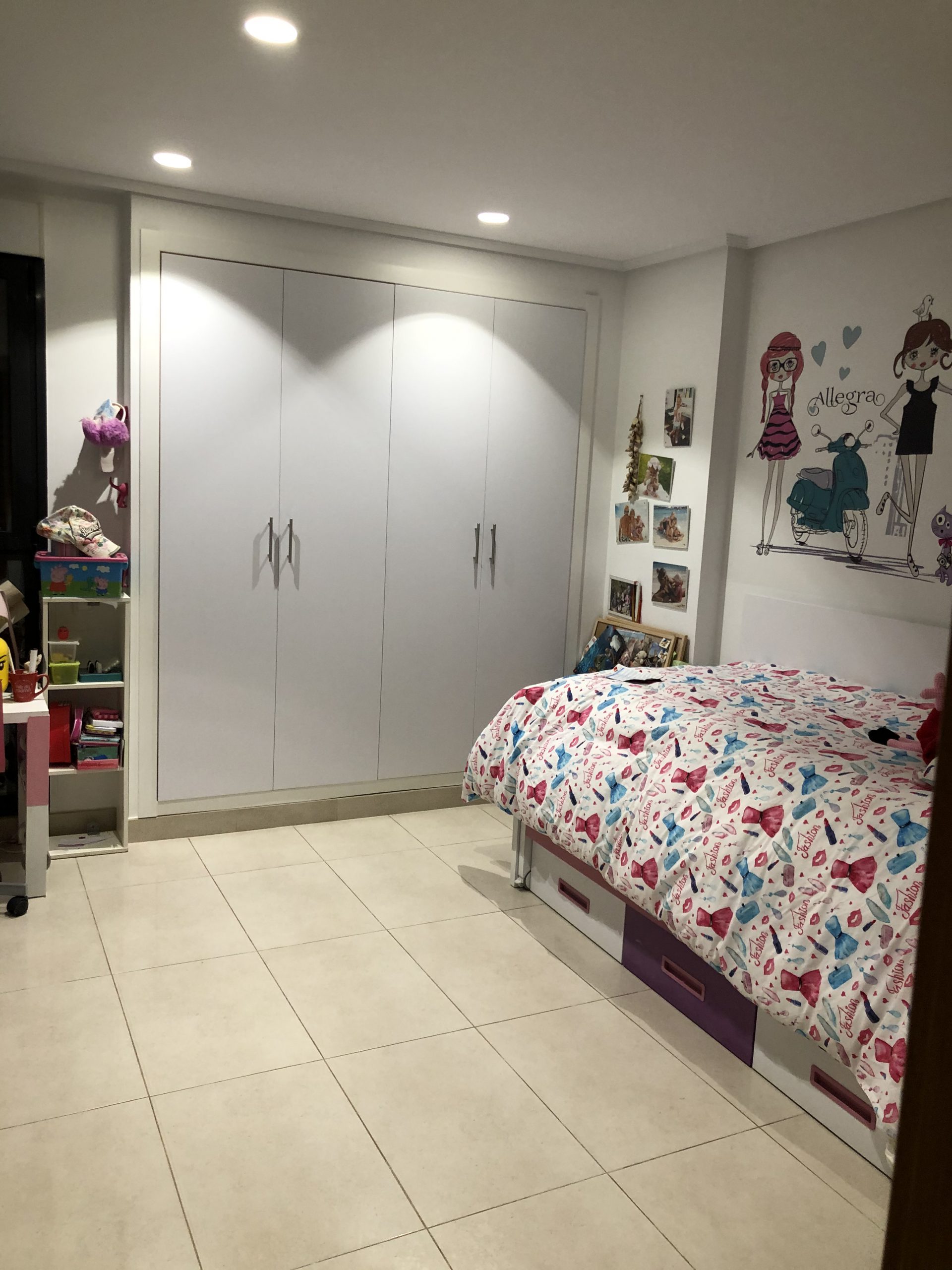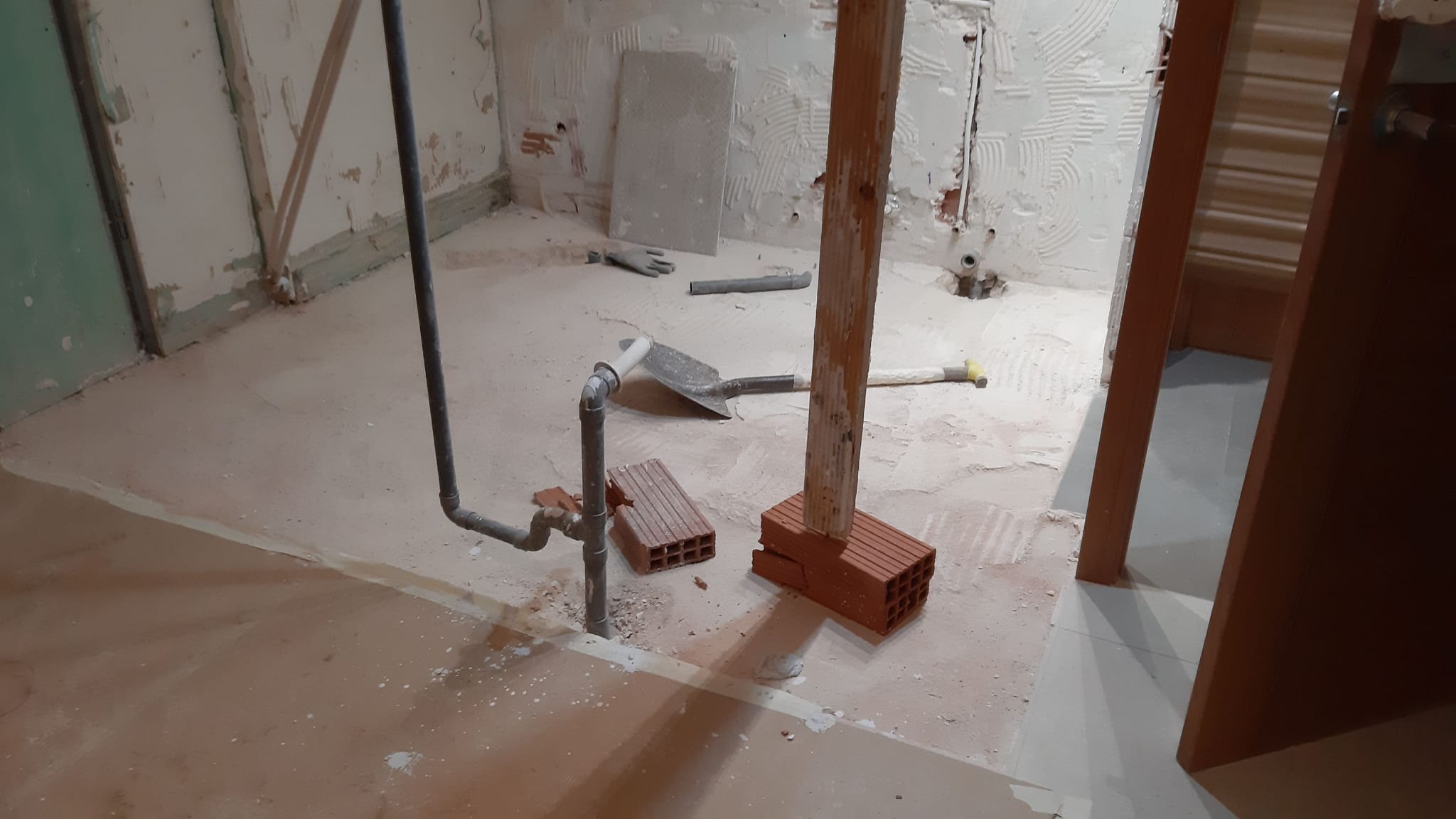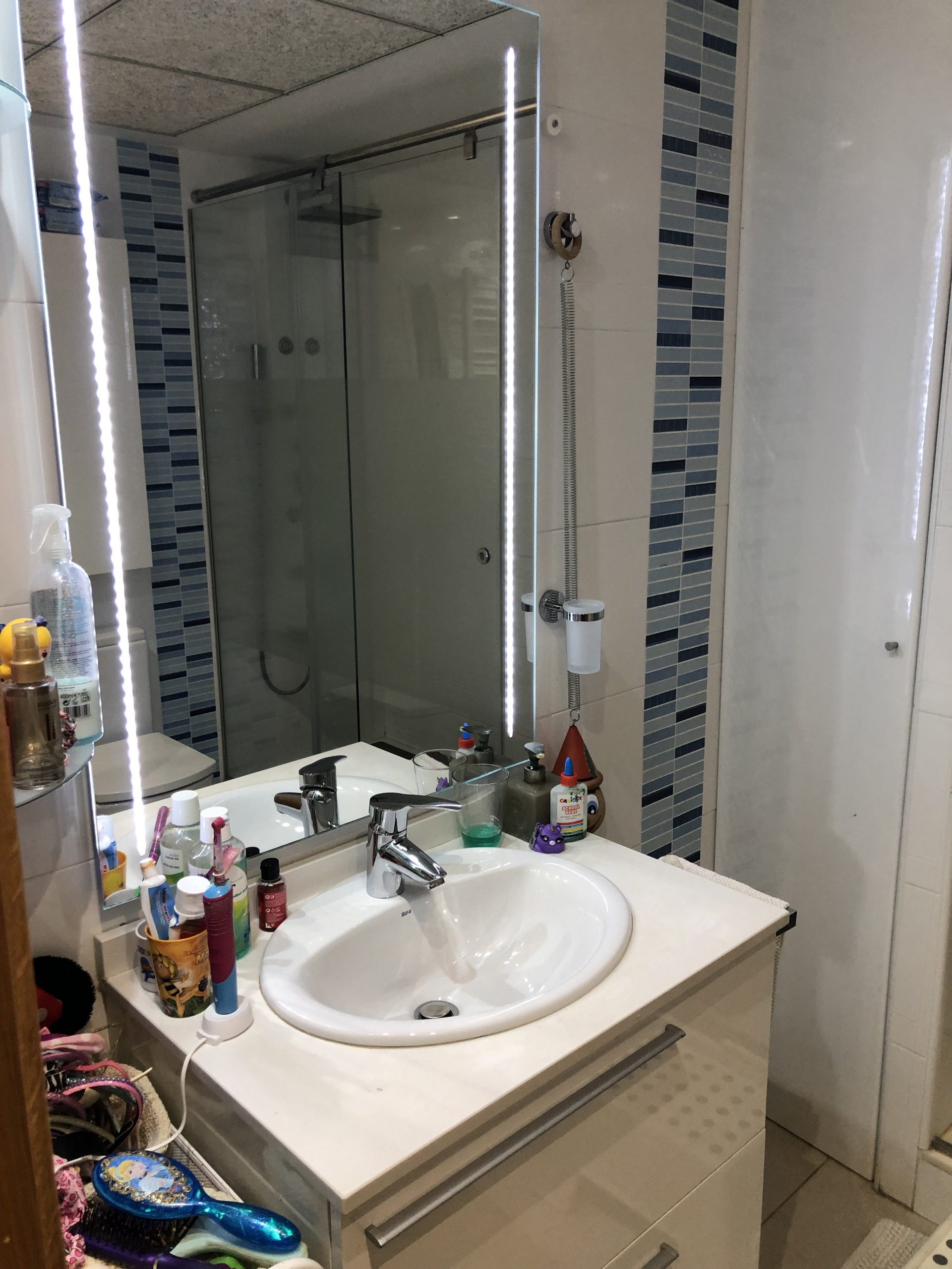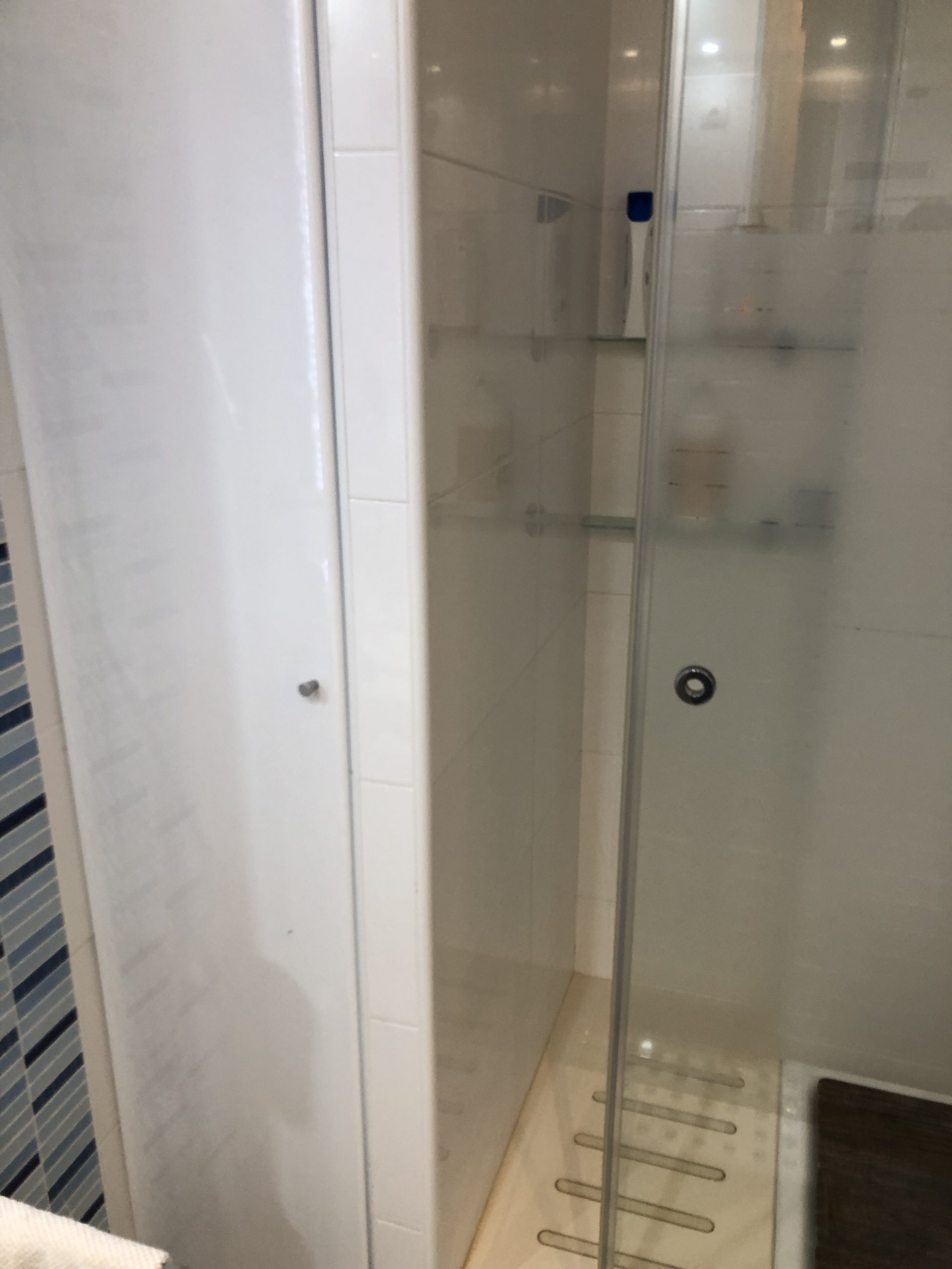 Reforma realizada para integral baño de pasillo en dormitorio para que sea una única estancia, Deferenciando los espacios por los distintos materiales y colores, con zona de higiene independiente con puerta de vidrio.