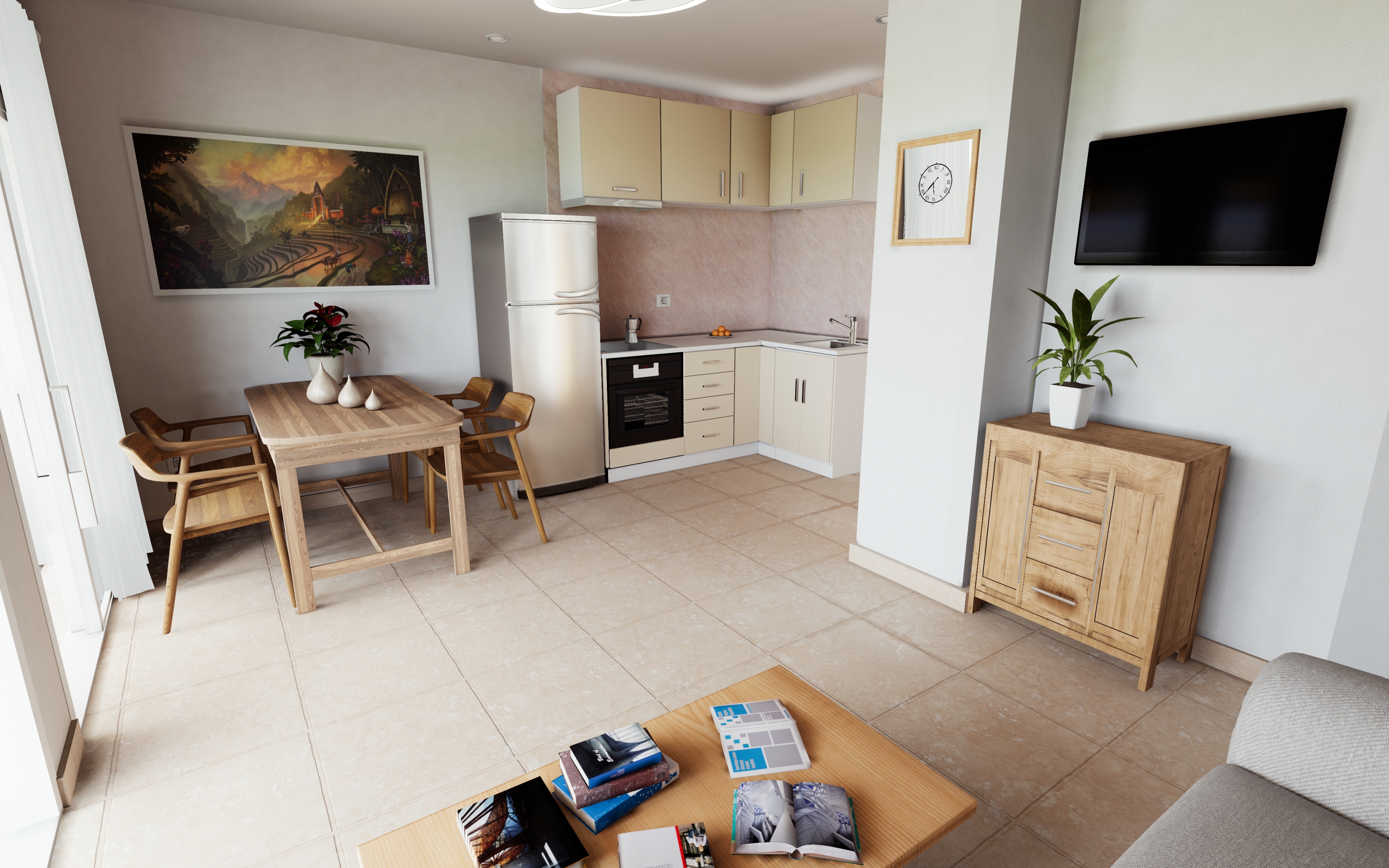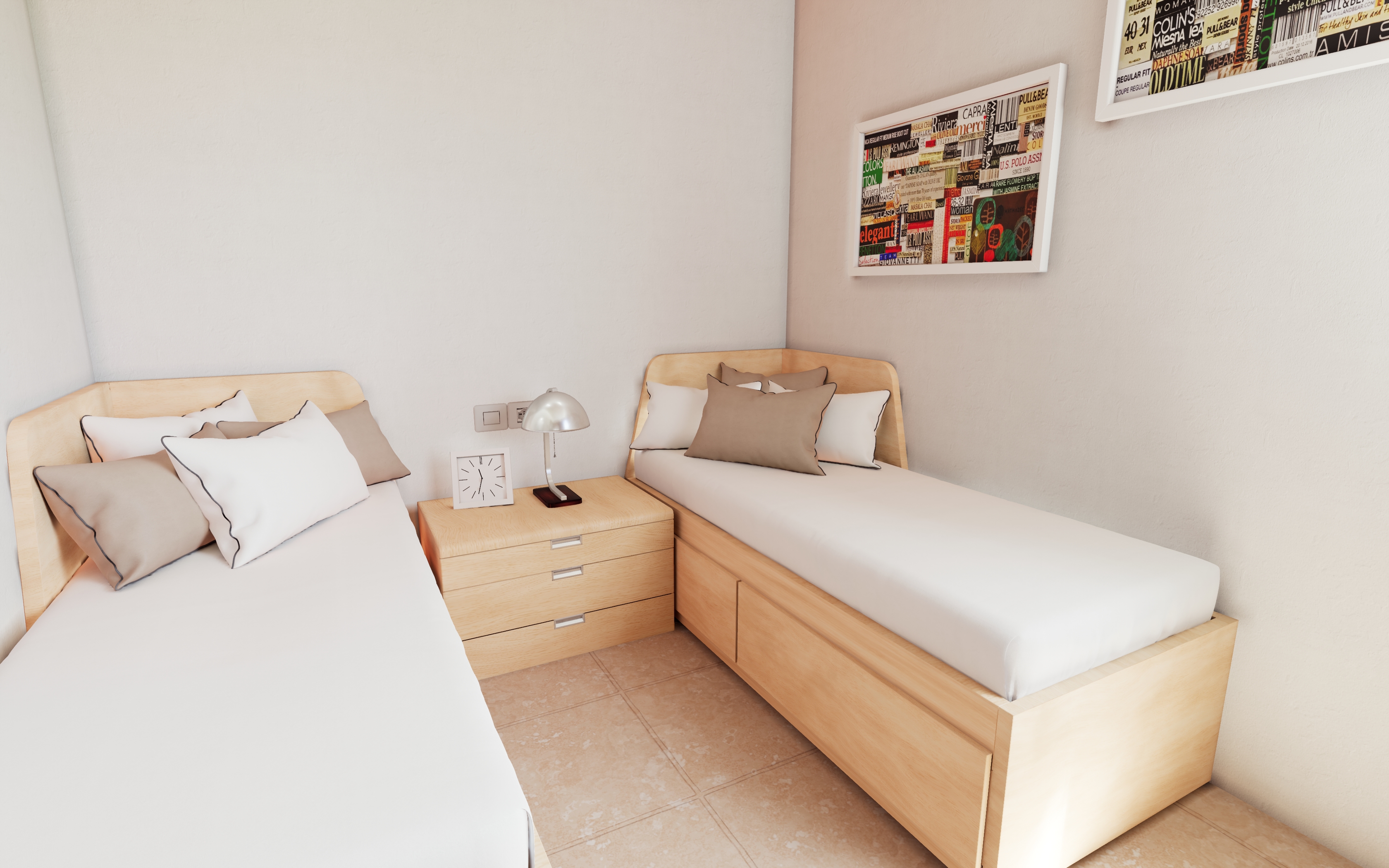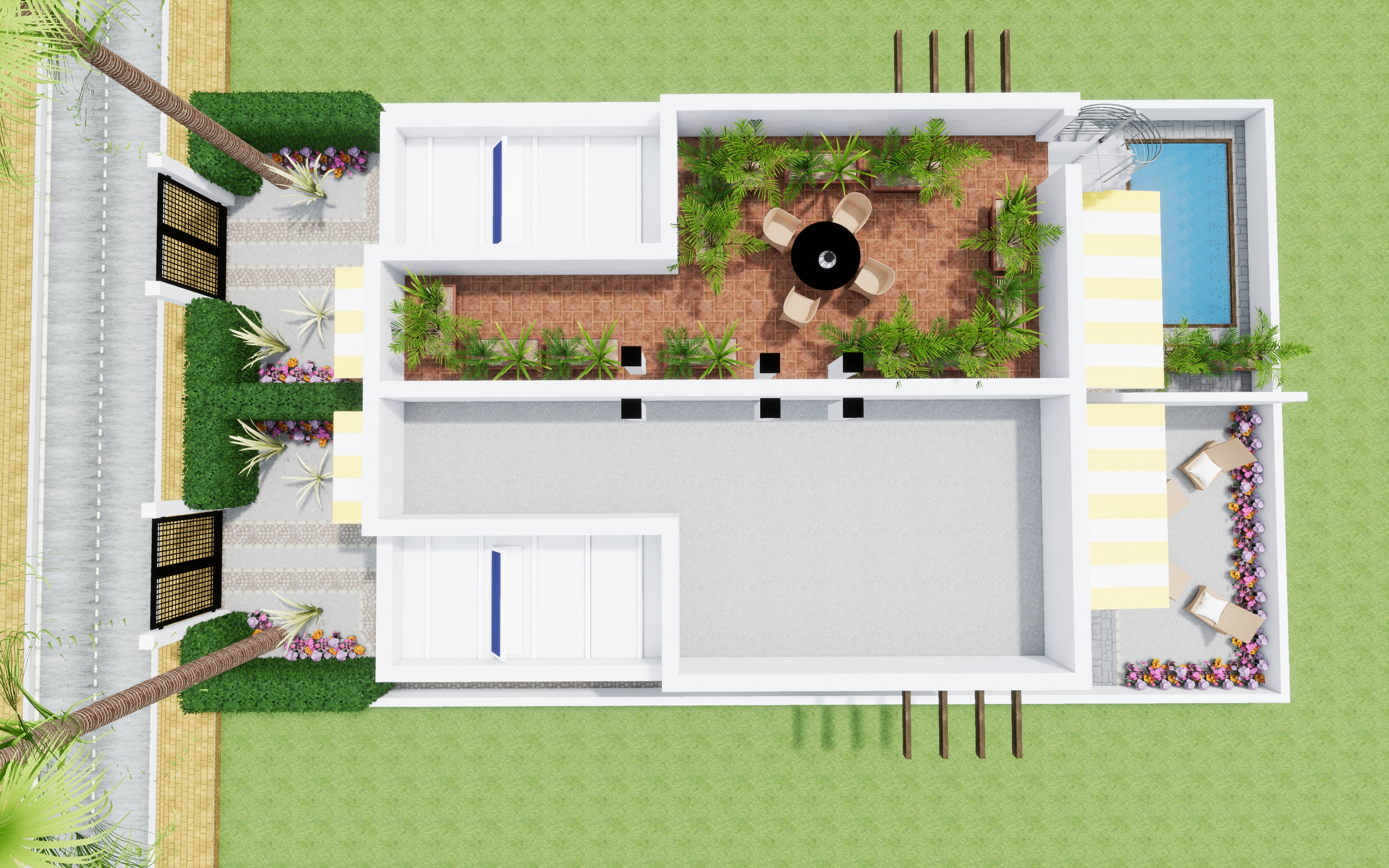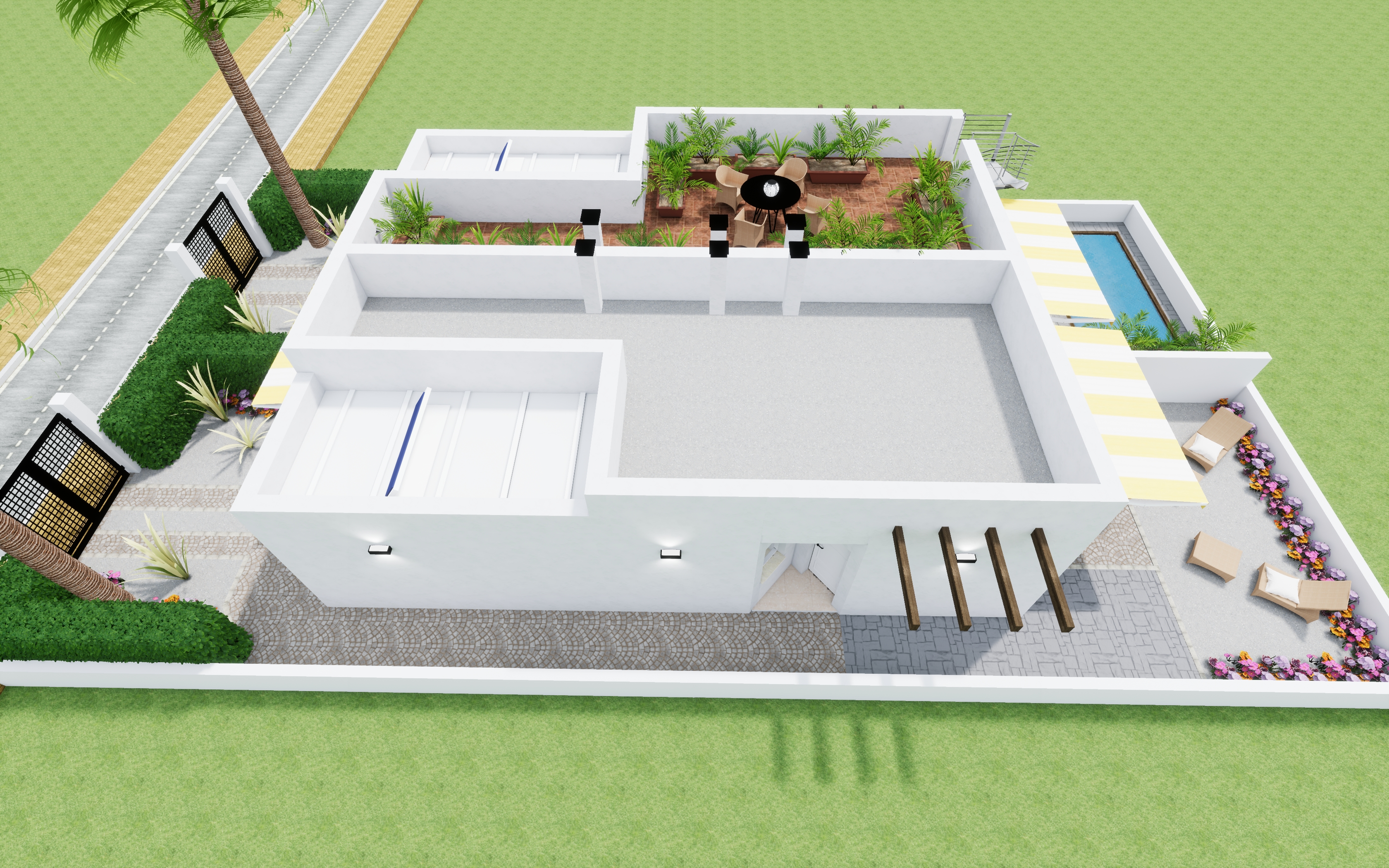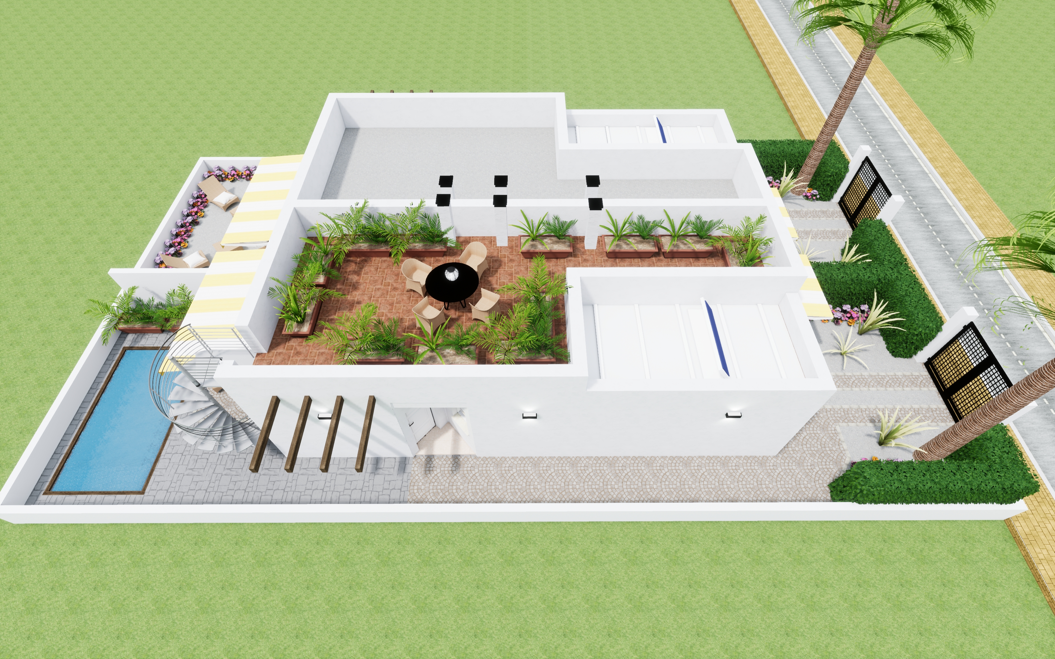 La vivienda constará de comedor, pequeña cocina abierta al comedor, baño y dos dormitorios. Dispone también de pequeña terraza ajardinada delantera, terraza con piscina trasera y tejado transitable con escalera de caracol para su acceso.