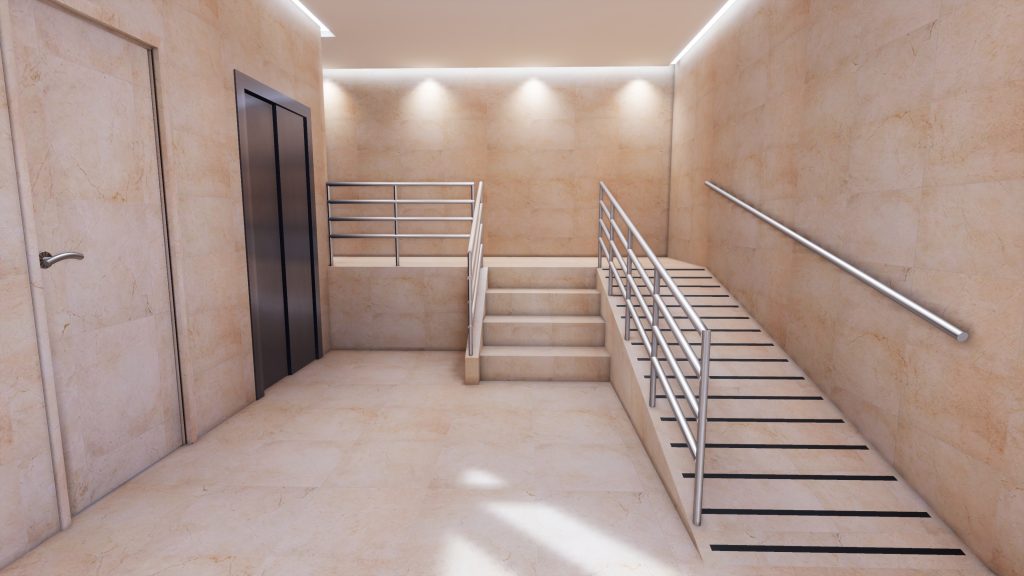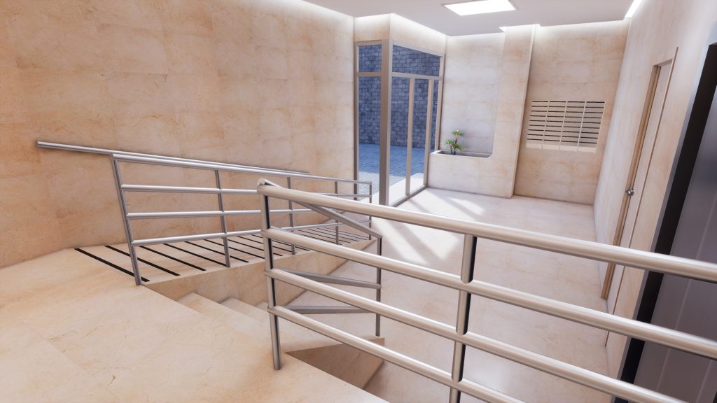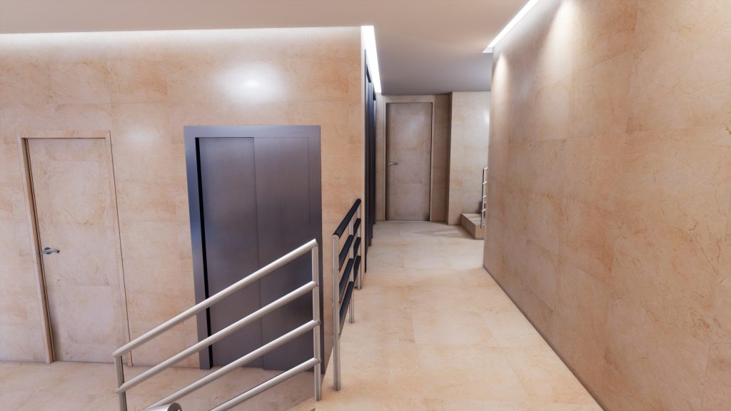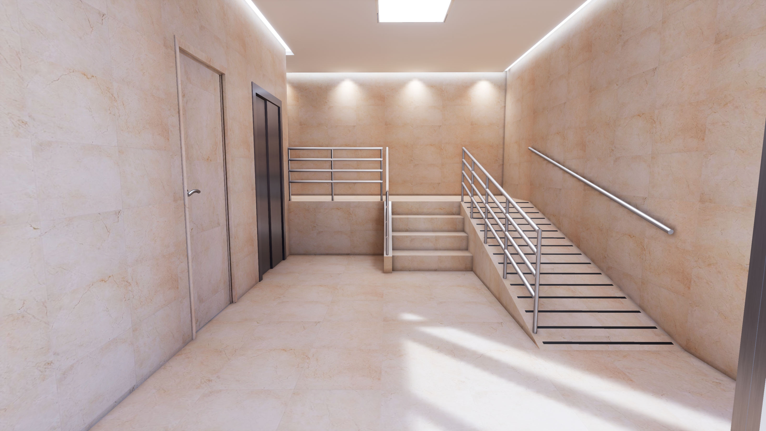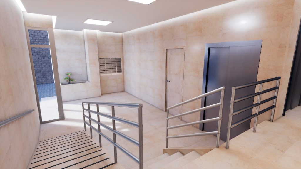 Zaguán B Proyecto 3D para el acondicionamiento y eliminación de barreras arquitectónicas de un zaguán ubicado en Valencia.
